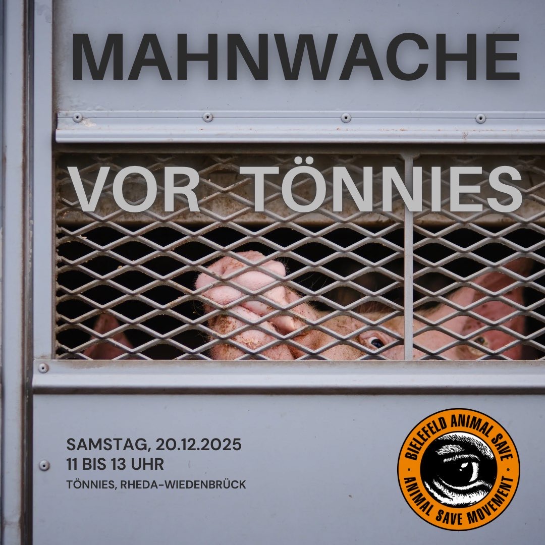 Weihnachts – Mahnwache der Tierrechtsorganisation »Bielefeld Animal Save« in Rheda, 20. Dezember 2025 Die Mahnwache versteht sich nicht als Ritual, sondern als klare Haltung: Gewalt gegen nichtmenschliche Tiere darf niemals zur Normalität werden – auch nicht jetzt zur Weihnachtszeit. Schilder und Banner sind für alle, die teilnehmen wollen, vorhanden.