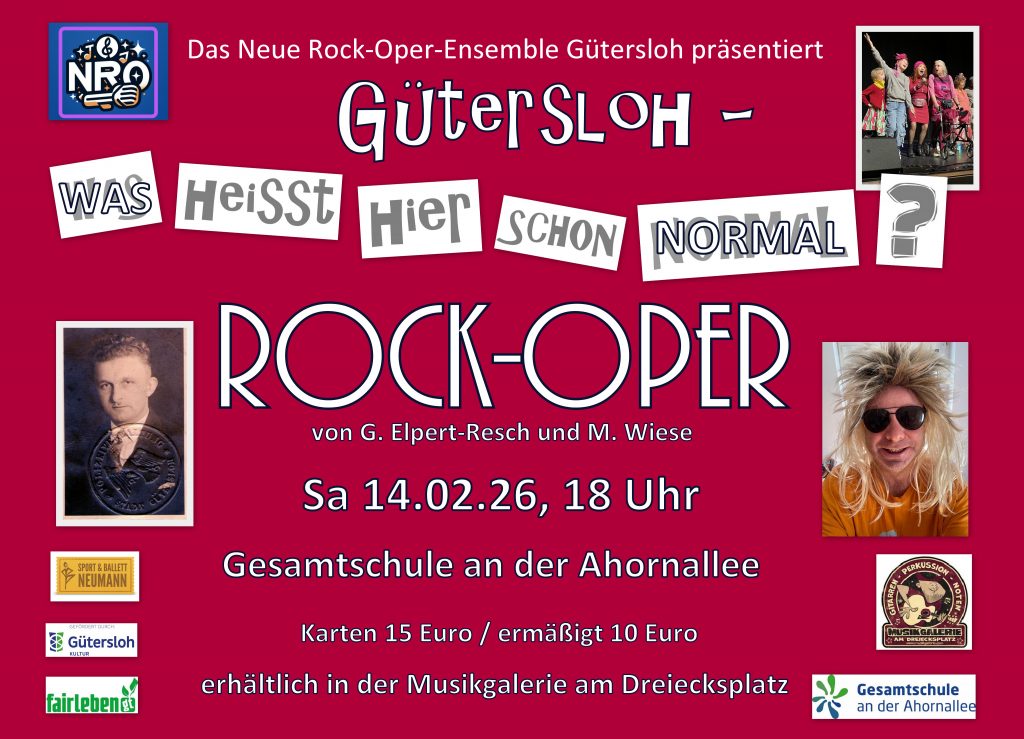 Das Neue Rockoper-Ensemble aus Gütersloh hatte bereits in früherer Zeit Erfolge mit Stücken wie „Denken Verboten!?“ und setzt sich aus allen möglichen Altersgruppen zusammen, so dass Menschen von fünf bis fünfundachtzig Jahren vertreten sind. Mit Gudrun Elpert-Resch als Komponistin und Leiterin starten sie nun in ihr neues Abenteuer. Das Besondere am Neuen Rockoper-Ensemble ist, dass jede*r zur Gestaltung des Stückes beitragen kann und somit ein ganz facettenreiches und besonderes Meisterwerk entsteht. Das inklusive und altersgemischte Ensemble ist für neue Mitwirkende offen!
