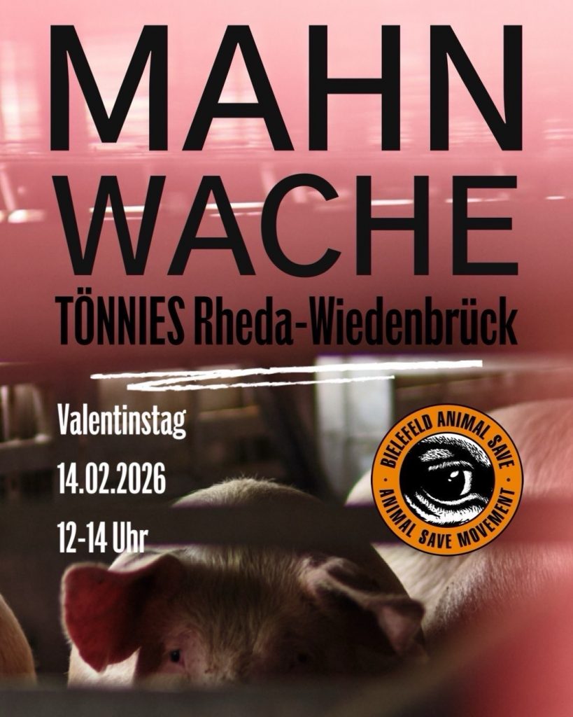 Die Mahnwache versteht sich nicht als Ritual, sondern als klare Haltung: Gewalt gegen nichtmenschliche Tiere darf niemals zur Normalität werden – auch nicht jetzt zur Weihnachtszeit. Schilder und Banner sind für alle, die teilnehmen wollen, vorhanden.